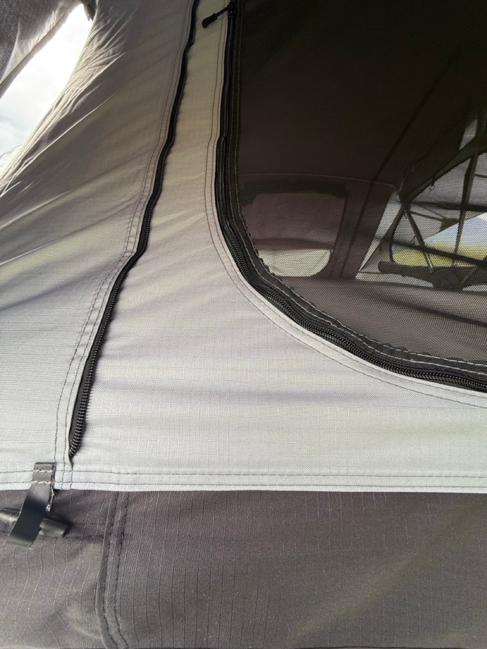 Tent body (gray part): rip-stop fabric with a waterproof and UV-resistant layer.